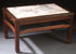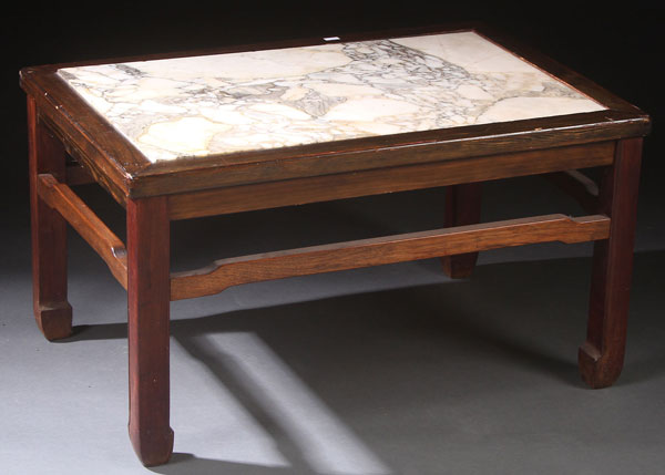 A CHINESE HARDWOOD AND MARBLE LOW TABLE, 20TH CENTURY. In mahogany with inset gray veined white marble top. Height 18 inches (46 cm), width 23.5 inches (83 cm), depth 21.25 inches (54 cm).
