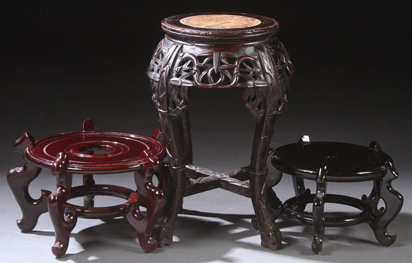 A CHINESE EXPORT CARVED HARDWOOD STAND, EARLY 20TH CENTURY. With inset marble top. Together with two contemporary stands for vases. Largest height 19.25 inches (48.5 cm).