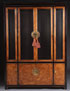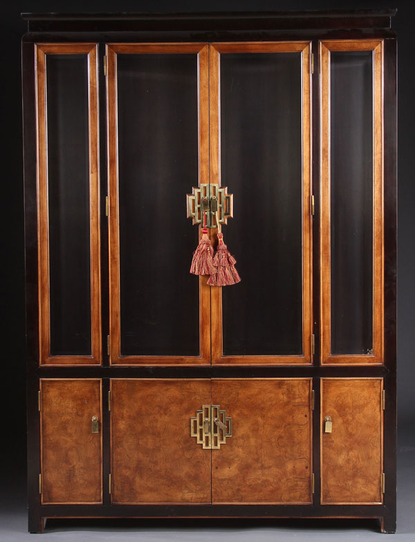 A FINE CENTURY FURNITURE CHINESE STYLE DISPLAY CABINET, LAST QUARTER 20TH CENTURY. Mahogany and ebonized wood, with two beveled glass doors and beveled side lights above four burlwood doors. Height 81.75 inches (207.5 cm), width 58 inches (147.5 cm), depth 16 inches (40.5 cm).