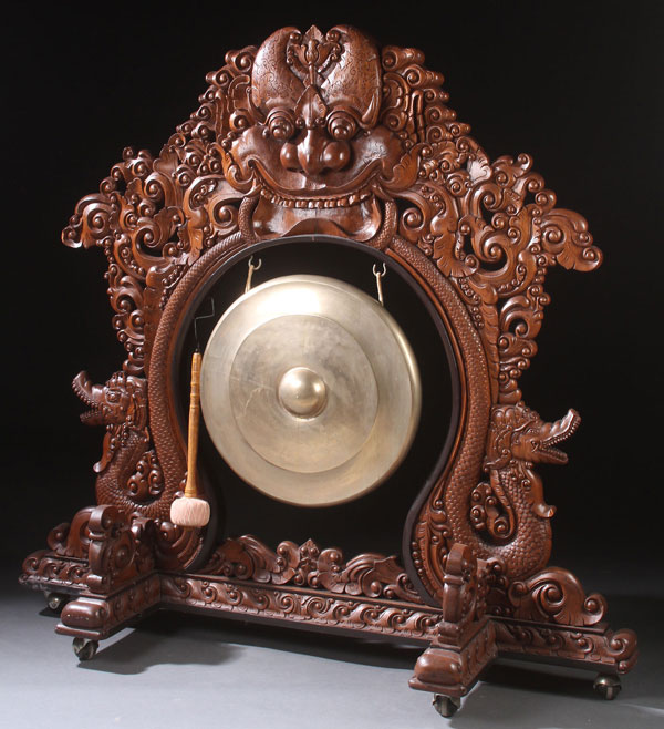 A LARGE CHINESE CARVED HARDWOOD DRAGON FORM PALACE GONG, 20TH CENTURY. Completely carved overall on each side with two scrolled dragons below a large mythical beast facial mask, suspending a 19.5 inch diameter gong of good tone. Total height 53.25 inches (135 cm), width 48 inches (122 cm).