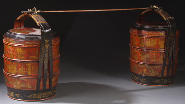 A PAIR OF CHINESE POLYCHROME WOOD FOOD CARRIERS, 20TH CENTURY. With shoulder yoke. Assembled length 62.5 inches (159 cm).