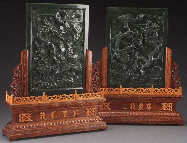 A PAIR OF CHINESE CARVED SPINACH JADE TABLE SCREENS, 20TH CENTURY. Each contained in carved hardwood stands, the plaques carved in deep relief with battling dragons and phoenix. 8 inches x 11 inches (20.3 x 28 cm), total height 15 inches (38.1 cm).