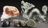 A FOUR PIECE CHINESE CARVED JADEITE GROUP, 20TH CENTURY. Comprising a white jade boulder with russet figural carved lion, a dragon carved green jadeite figure, a green and white jade carved figure of a Buddha on pouch form, and a celadon jade carved toasting cup with a figural dragonette and archaic scrolls. Largest length 9.25 inches (23.5 cm).