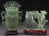 A LARGE CHINESE CARVED HARDSTONE LIDDED URN, 20TH CENTURY. Of archaic form with reticulated and suspended loose ring handles, raised on a carved hardwood stand. Together with a carved hardstone fish form vase. Each in semi-translucent green stone with black inclusions. Largest height 8.5 inches (21.6 cm) excluding stand.
