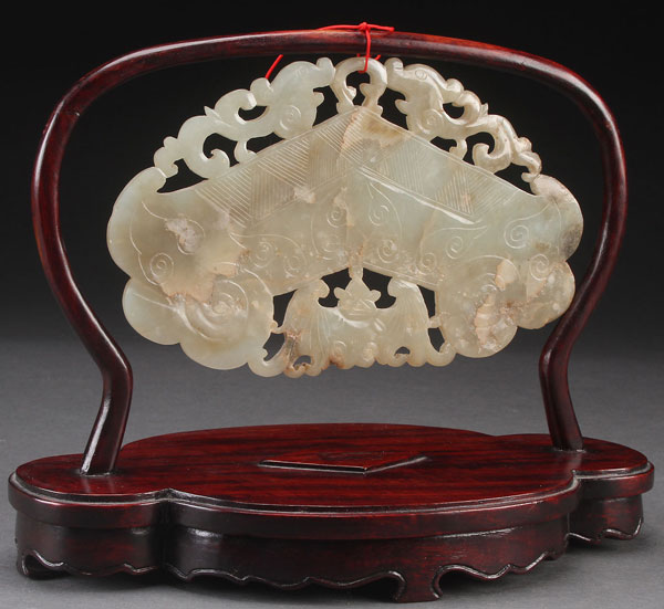 A CHINESE CARVED WHITE JADE ARCHAIC STYLE CHIME, PROBABLY 20TH CENTURY. With pierced carved dragonettes, ruyi forms, and a bat. Suspended from a carved mahogany stand. Jade length 8 inches (20.3 cm). Overall height 8 inches (20.3 cm).
