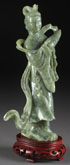 A CHINESE CARVED JADEITE FIGURE OF KWANYIN. Carved in celadon colored green jadeite with open flowing robes raised on a carved hardwood stand. The jadeite 10.25 inches (26 cm).