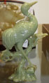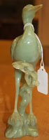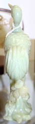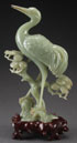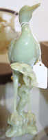 A CHINESE CARVED CELADON JADE FIGURE OF A HERON, 20TH CENTURY. On a rockery base with pine tree, raised on a carved hardwood stand. Total height 10 inches (25 cm).