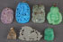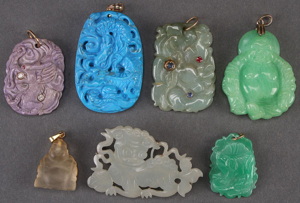 A CHINESE CARVED JADE AND GEMSTONE MOUNTED PENDANT GROUP, 20TH CENTURY. Comprising a dragon carved lavender jadeite pendant set with two full cut diamonds set in gold bezels and a ruby eye, a celadon jade dragon carved pendant with ruby and two sapphires in gold prong settings, a green jadeite carved Buddha pendant, a green jadeite mythical beast pendant, a dragon carved blue lapis pendant with 14k suspension loop, and a white jade carved Foo Lion set in a conforming silver pin-hinged backing stamped with indistinct Chinese hallmarks, together with carved and frosted crystal Buddha pendant. The largest 2.125 inches (53mm).