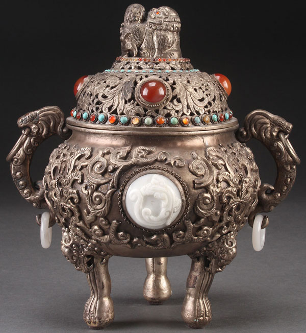 A CHINESE MONGOLIAN SILVERED CENSER, 20TH CENTURY. With embossed and reticulated floral designs, mounted with white carved hardstone medallions of dragons, carnelian cabochons, and jeweled beadwork. The handles suspended with white jade rings. The lid with Foo dog finial. Height 10.5 inches (26.7 cm).