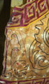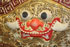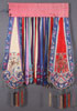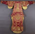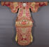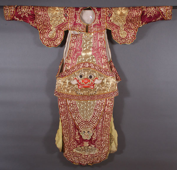 A CHINESE EMBROIDERED SILK FESTIVAL ROBE, 20TH CENTURY. Finely stitched with bullion threads and with a padded facial mask of a mythical beast, on a dark lavender and yellow ground. Length 52 inches (132 cm).