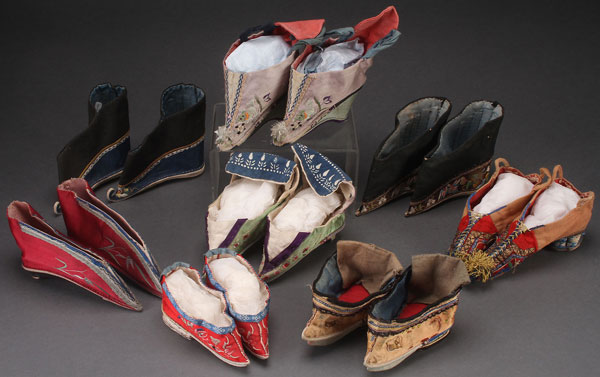 EIGHT PAIRS OF ORIENTAL EMBROIDERED SILK SHOES, EARLY 20TH CENTURY. All for bound feet, mostly child size. Largest height 3.5 inches (9 cm).