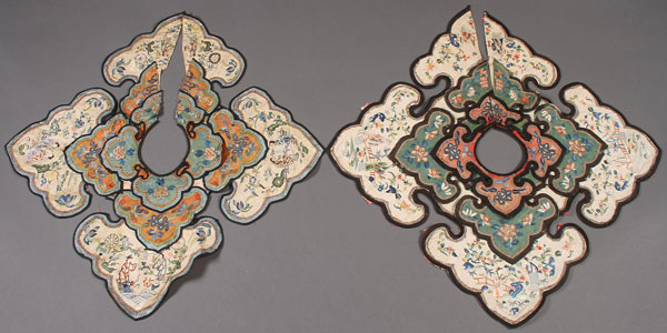 A PAIR OF CHINESE EMBROIDERED PI LING SILK COLLARS, PROBABLY LATE 19TH CENTURY. Of squared form with ruyi shape corners, comprising three overlapping layers and finely embroidered with figures in a garden setting and floral blossoms. Largest 21 inches (53.5 cm) square.