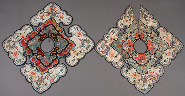 A PAIR OF CHINESE EMBROIDERED PI LING SILK COLLARS, PROBABLY LATE 19TH CENTURY. Of squared form with ruyi shape corners, comprising three overlapping layers and finely embroidered with dragons, phoenix, florals and auspicious symbols. Largest 19 inches (49 cm) square.