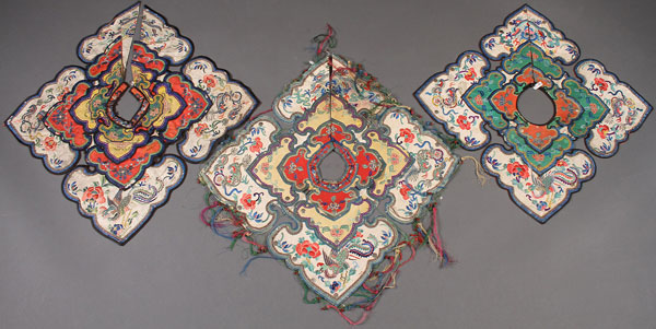 A GROUP OF THREE CHINESE EMBROIDERED PI LING SILK COLLARS, PROBABLY LATE 19TH CENTURY. Of squared form with ruyi shape corners, comprising three overlapping layers and finely embroidered with dragons, phoenix, and florals. Largest 20.5 inches (52 cm) square.