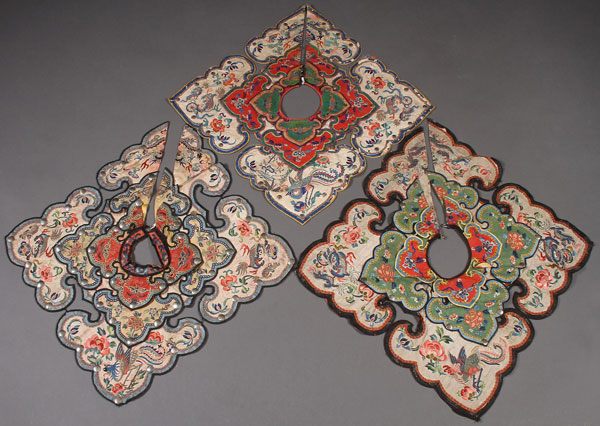 A GROUP OF THREE CHINESE EMBROIDERED PI LING SILK COLLARS, PROBABLY LATE 19TH CENTURY. Of squared form with ruyi shape corners, comprising three overlapping layers and finely embroidered with dragons and florals. Largest 21 inches (53 cm) square.
