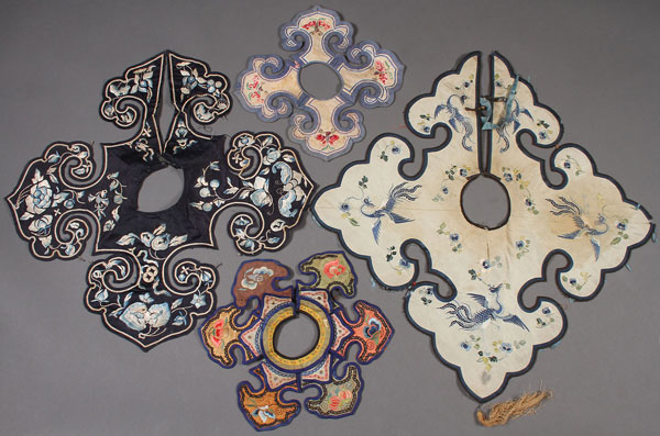 A GROUP OF THREE CHINESE EMBROIDERED PI LING SILK COLLARS, PROBABLY LATE 19TH CENTURY. Of squared form with ruyi shape corners, one with two overlapping layers, comprising two adult and two children each with finely embroidered designs. Largest 18.5 inches (47 cm) square.