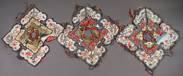 A GROUP OF THREE CHINESE EMBROIDERED SILK COLLARS, PROBABLY LATE 19TH CENTURY. Of squared form with ruyi shape corners, comprising three overlapping layers and finely embroidered with a variety of florals, auspicious symbols, butterflies and other animal forms. Largest 21 inches (53 cm) square.