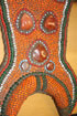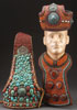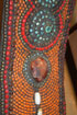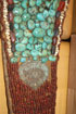 A THREE PIECE GROUP OF CHINESE CEREMONIAL BEADWORK, 20TH CENTURY. Comprising a head piece overlaid with turquoise and amber nuggets, outlined with river pearls and mahogany beadwork. A similar head piece overlaid with turquoise and carnelian rosettes on a beadwork field of orange, amber, red, and brass colored beads. With a similar beaded ceremonial collar inset with six carnelian stones in gilt metal and turquoise bezels. Largest length 30 inches (76 cm).