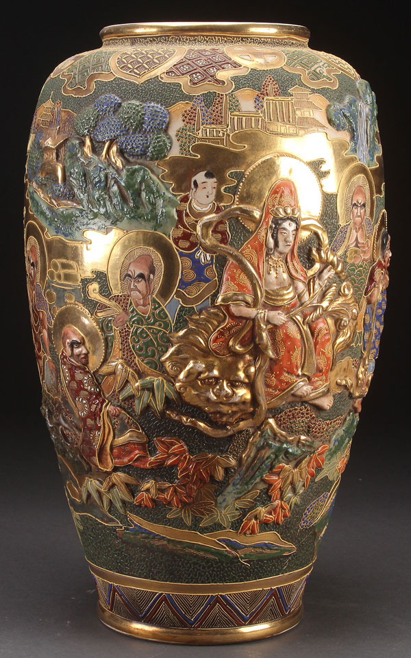 A LARGE AND IMPRESSIVE JAPANESE SATSUMA FLOOR VASE, EARLY 20TH CENTURY. Of ovoid form elaborately decorated with raised and embossed scenes of Kwanyin and Lohan, further decorated with gilt and raised enameling. Height 17.75 inches (45 cm).