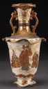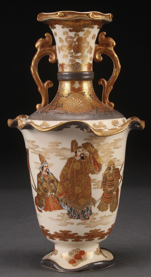 A VERY FINE SATSUMA HANDLED VASE, MEIJI PERIOD. Decorated with seven warlords in battle dress with finely tooled gilt enamels. Height 9 inches (23 cm).
