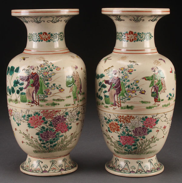 A FINE PAIR OF JAPANESE KINKOZAN SIGNED ENAMELED POTTERY VASES, MEIJI PERIOD. Of baluster form, each finely enameled with figures in garden setting, scrolling cherry blossoms and birds in flight, the sides signed "Kinkozan" in three characters. Height 12.5 inches (32 cm).