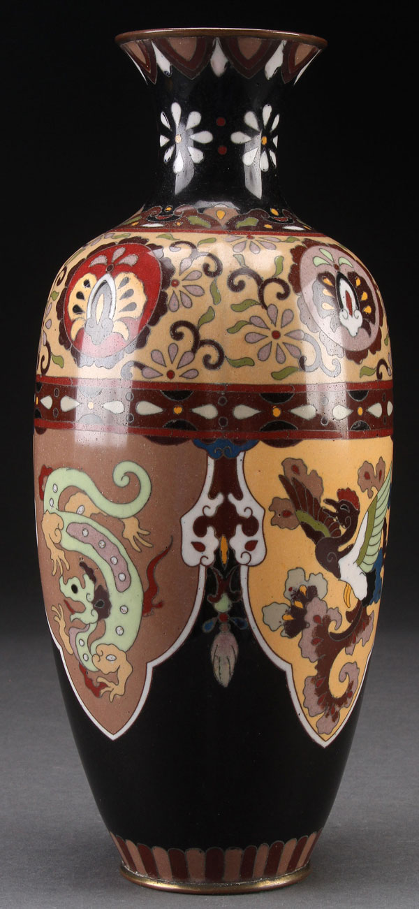 A JAPANESE CLOISONNÉ VASE, PROBABLY MEIJI. With ribbed sides decorated with dragons and cranes, the mouth flared. Height 11.75 inches (29.5 cm).