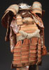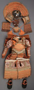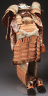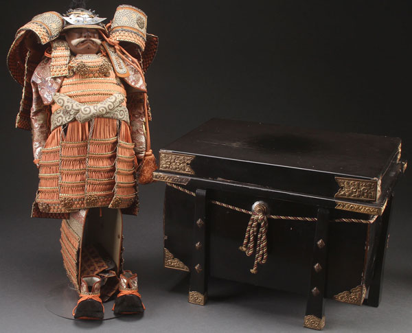 A JAPANESE MODEL OF SAMURAI ARMOR, FIRST HALF 20TH CENTURY. Silk, embossed gilt metal, and leather. Height approximately 22 inches (56 cm) and contained in a black lacquer box with gilt embossed metal mounts. Length of box 18.5 inches (47 cm).