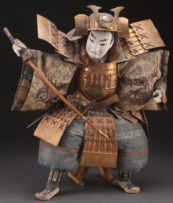 A LARGE AND IMPRESSIVE JAPANESE NINGYO DOLL, MEIJI PERIOD. With gofun face and hands and inset glass eyes, finely dressed in silk embroidered and woven textiles, embossed metal, and pressed paper armor. Height 21 inches (53 cm).