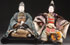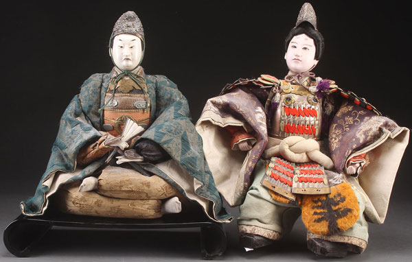 A PAIR OF LARGE JAPANESE NINGYO DOLLS, MEIJI PERIOD. Each depicting warrior figures with gofun face and hands, inset glass eyes, and period style clothing. Largest height 18.5 inches (47 cm).