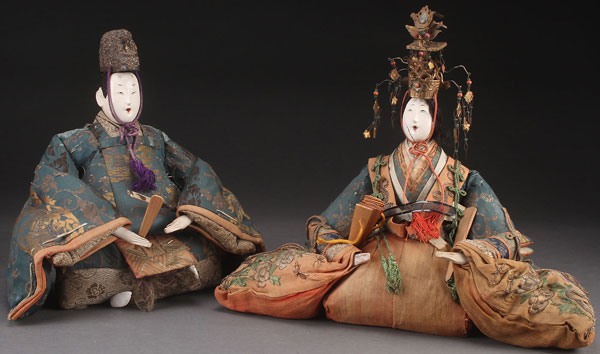 A PAIR OF JAPANESE NINGYO DOLLS, MEIJI PERIOD OR PERHAPS LATE EDO. Depicting an Emperor and Empress in seated form with gofun faces and period style woven silk clothing. Some loses. Largest height 10.5 inches (26.5 cm).
