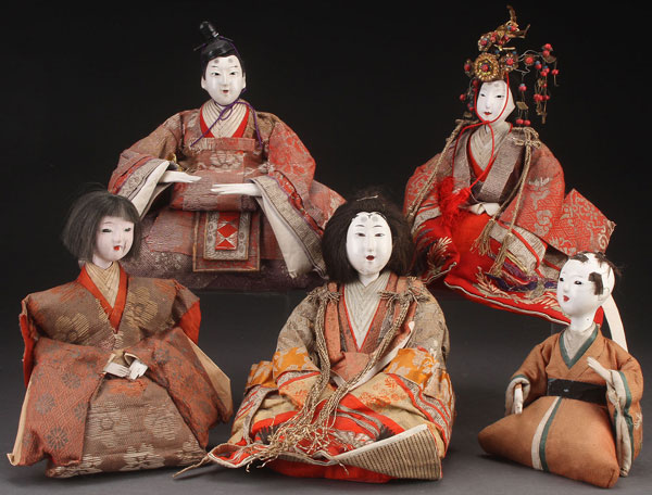 A GROUP OF FIVE JAPANESE NINGYO DOLLS, MEIJI PERIOD. Each with gofun faces and inset glass eyes, dressed in woven silk garments. Largest height 10 inches (20.5 cm).