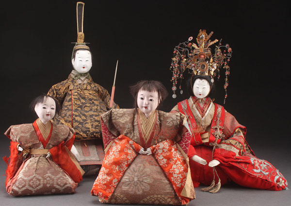 A GROUP OF FOUR LARGE JAPANESE NINGYO DOLLS, MEIJI PERIOD. Comprising an Emperor and Empress, together with two smaller Geishas. Each with gofun faces and hands, inset glass eyes, and woven silk garments. Largest height 19 inches (49.5 cm) including headdress.