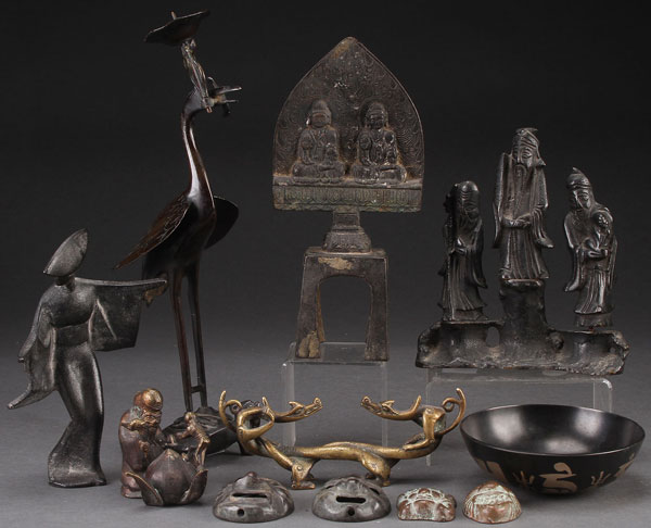 A CHINESE AND JAPANESE FIGURAL BRONZE GROUP, 20TH CENTURY. Comprising an egret on turtle candle stand, Buddhist figures, an entwined dragon scroll weight, an Art Deco geisha, and other items. Largest height 13 inches (33 cm).