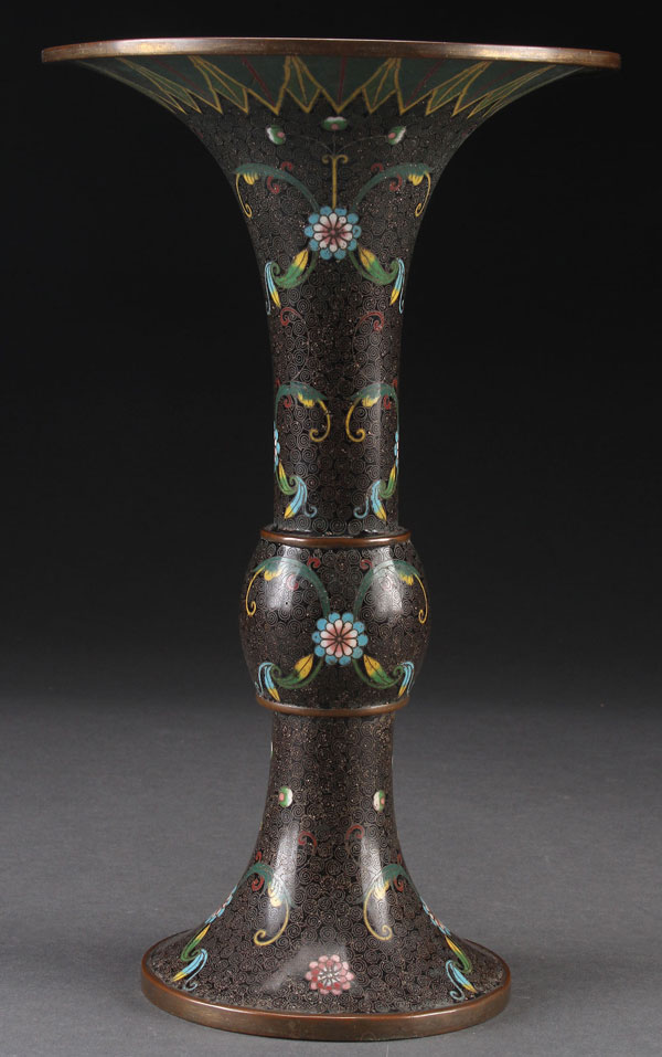A VERY FINE CHINESE CLOISONNÉ YEN YEN VASE. With knopped stem below a wide flared rim. Height 11.25 inches (28.5 cm).