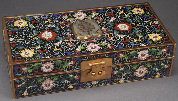 A FINE CHINESE CLOISONNÉ AND CARVED JADE COVERED BOX, 20TH CENTURY. The exterior enameled with multicolored interlocking flowers on a black ground and mounted with a pierced carved celadon jade plaque of two Kylin. The interior enameled with florals and butterflies on a turquoise ground. Length 12.5 inches (32 cm).