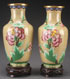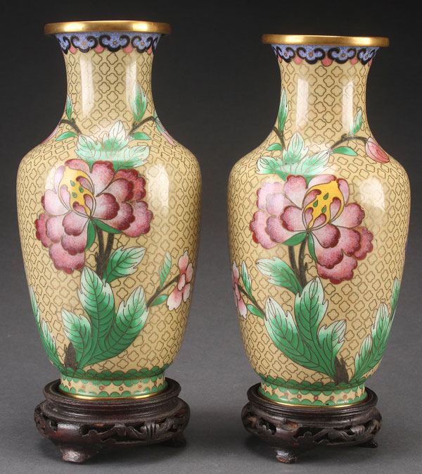 A PAIR OF CHINESE CLOISONNÉ ENAMELED VASES, 20TH CENTURY. Each decorated with prunus and blossoms on a pale yellow ground. Height 8.25 inches (21 cm). Raised on carved hardwood stands and contained in a fitted box with People's Republic of China paper label.