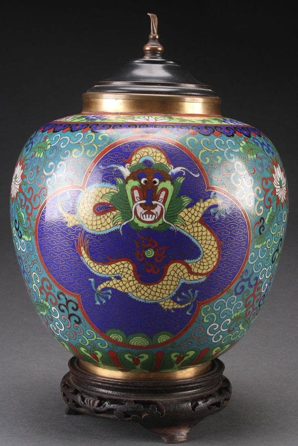 A CHINESE CLOISONNÉ ENAMELED COVERED JAR, 20TH CENTURY. Decorated with Imperial dragons and interlocking flowers on a turquoise ground. Replaced lid. Total height 10.75 inches (27 cm).