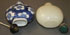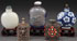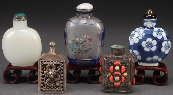A GROUP OF FIVE CHINESE SNUFF BOTTLES, 20TH CENTURY. Comprising a translucent glass, a reverse painted Peking cameo glass, a blue and white porcelain, a silver snuff bottle with dragon panels, and a Mongolian style. Largest height 3.5 inches (9 cm).