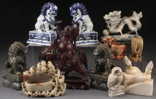 A COLLECTION OF ORIENTAL DECORATIVE ARTS, 20TH CENTURY. 12 pieces, comprising various carved soap stone figures, blue and white porcelain temple lions, and a laughing Buddha riding atop a beast in carved mahogany. Largest height 9 inches (22.5 cm).