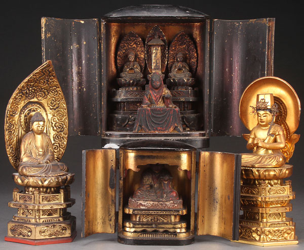 A FINE GROUP OF JAPANESE GILT AND LACQUERED ZUSHI (SHRINES) AND BUDDHAS, MEIJI PERIOD. Comprising two traveling shrines, the largest depicting a monk with two seated Buddhas, the second smaller with polychrome Buddha. Together with two carved and gilt seated Buddhas raised on shaped plinths. Largest height 9.5 inches (24 cm).