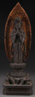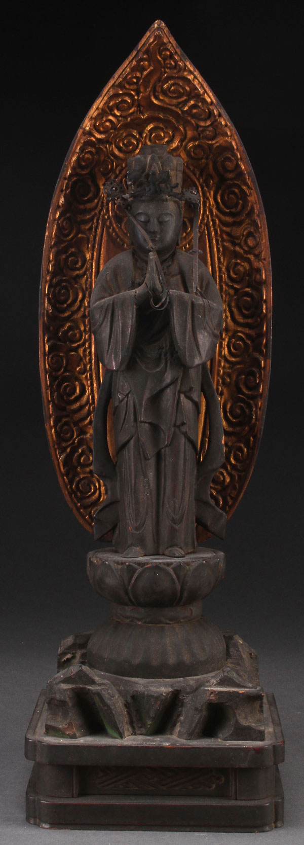 A LARGE JAPANESE CARVED AND GILT WOOD FIGURE OF BUDDHA, MEIJI PERIOD. In standing prayerful form on a double lotus base with gilt mandorla. Height 20 inches (51 cm)