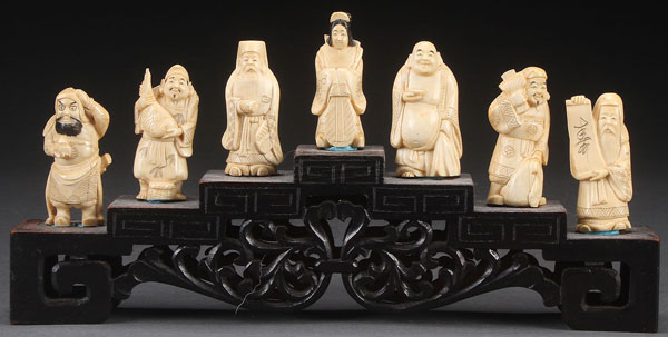A GROUP OF SEVEN JAPANESE CARVED IVORY IMMORTALS, MEIJI PERIOD. Displayed on a stepped carved wooden stand, average height 2.5 inches (6.5 cm). Total length 11.75 inches (30 cm).