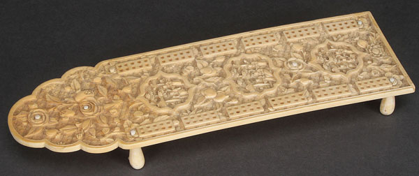 A CHINESE EXPORT CARVED IVORY CRIBBAGE BOARD, LATE 19TH CENTURY. With village scenes carved in three medallions on a floral relief ground. Length 9.5 inches (24 cm).