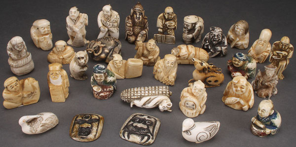A COLLECTION OF 32 JAPANESE CARVED IVORY NETSUKES, PROBABLY MEIJI PERIOD. Comprising various figures with incised and stained highlights. The largest 2 inches (5 cm).