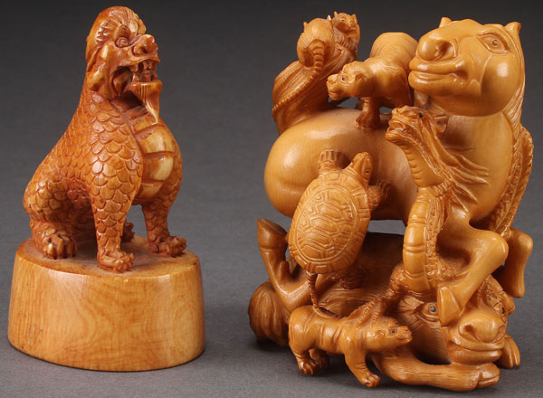 AN ORIENTAL CARVED IVORY GROUP, CIRCA 1900. With tea stained patina, comprising a Zodiac animal figural group and a mythical beast seal. The largest height 3.5 inches (9 cm).