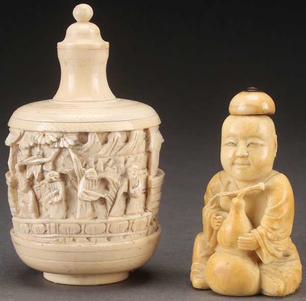 TWO CHINESE EXPORT CARVED IVORY SNUFF BOTTLES, QING DYNASTY. Carved with a village setting in the round and an immortal with double gourd. Largest 4 inches (10 cm).