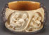 AN ORIENTAL CARVED IVORY AND SILVER MOUNTED BANGLE, PROBABLY CIRCA 1900. Carved with four erotic scenic medallions. Interior diameter 2.25 inches (7 cm), width 1.25 inches (3 cm).