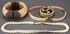 A CARVED JEWELRY GROUP, 20TH CENTURY. Comprising an Oriental silver mounted hinged bangle, a four section choker, a flat beaded necklace, and scrimshawed drum form. The longest 8.5 inches (21.5 cm).