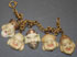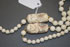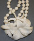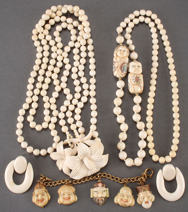 AN ORIENTAL CARVED IVORY GROUP, PROBABLY CIRCA 1900. Comprising a double strand beaded necklace with carved floral pendant, a beaded necklace with two large figural beads, a gold filled bracelet with five mask form charms and two loop earrings. Largest length 16.25 inches (41 cm).