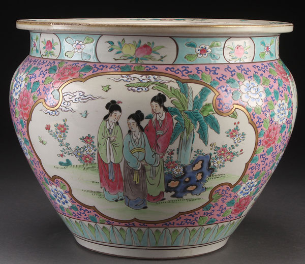 A LARGE CHINESE HAND-PAINTED POTTERY JARDINIÈRE, 20TH CENTURY. Decorated with two large cartouches of figures reserved on a foliate ground. Diameter 15 inches (38 cm).